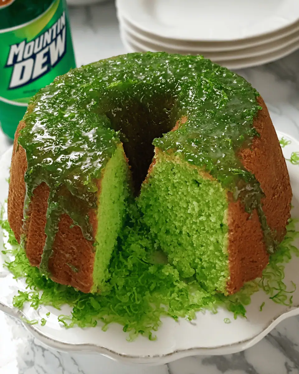 There is a special category of desserts that I like to call "don't knock it 'til you try it," and this Mountain Dew Cake is the reigning champion. It sounds like a novelty-and with its neon green interior, it certainly looks like one-but the flavor is genuinely incredible. It's essentially a "citrus explosion" pound cake. If that sounds unhinged, just wait until you try The Ultimate Baja Blast Pie, which somehow turns the famous soda into a creamy, no-bake masterpiece. Or go even more classic with the Sweet and Tangy Mountain Dew Pie from Scratch, which brings serious Key Lime vibes with a bold soda twist. By doctoring an orange cake mix with lemon pudding, lime flavoring, and a cup of fizzy Mountain Dew, you get a cake that is unbelievably moist, tender, and packed with zesty, lemon-lime flavor. The magic finish is a hot butter-and-soda glaze that soaks into the cake while it's still in the pan, creating a sticky, sweet crust that keeps the inside soft for days.